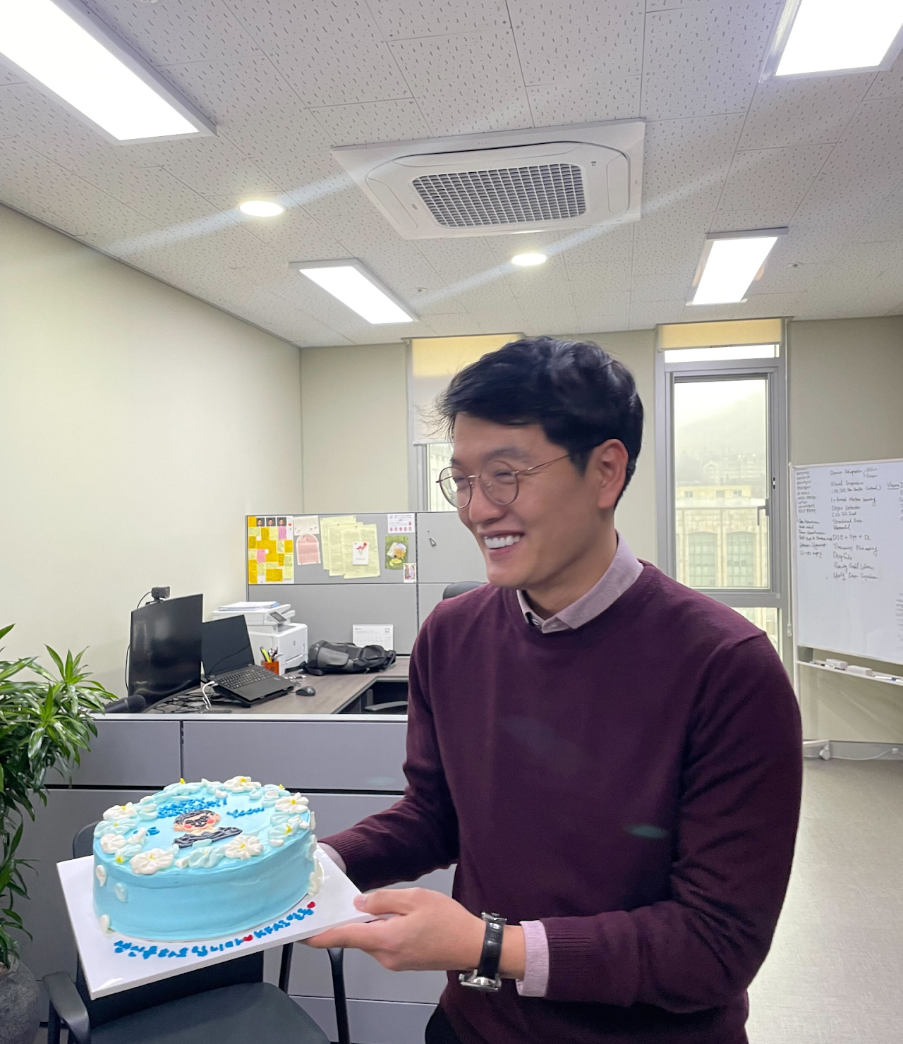 2023년 12월 15일 윤현수 교수님의 생신을 축하드리기 위해 연구원이 모여 축하 인사와 케이크를 전달드렸습니다.